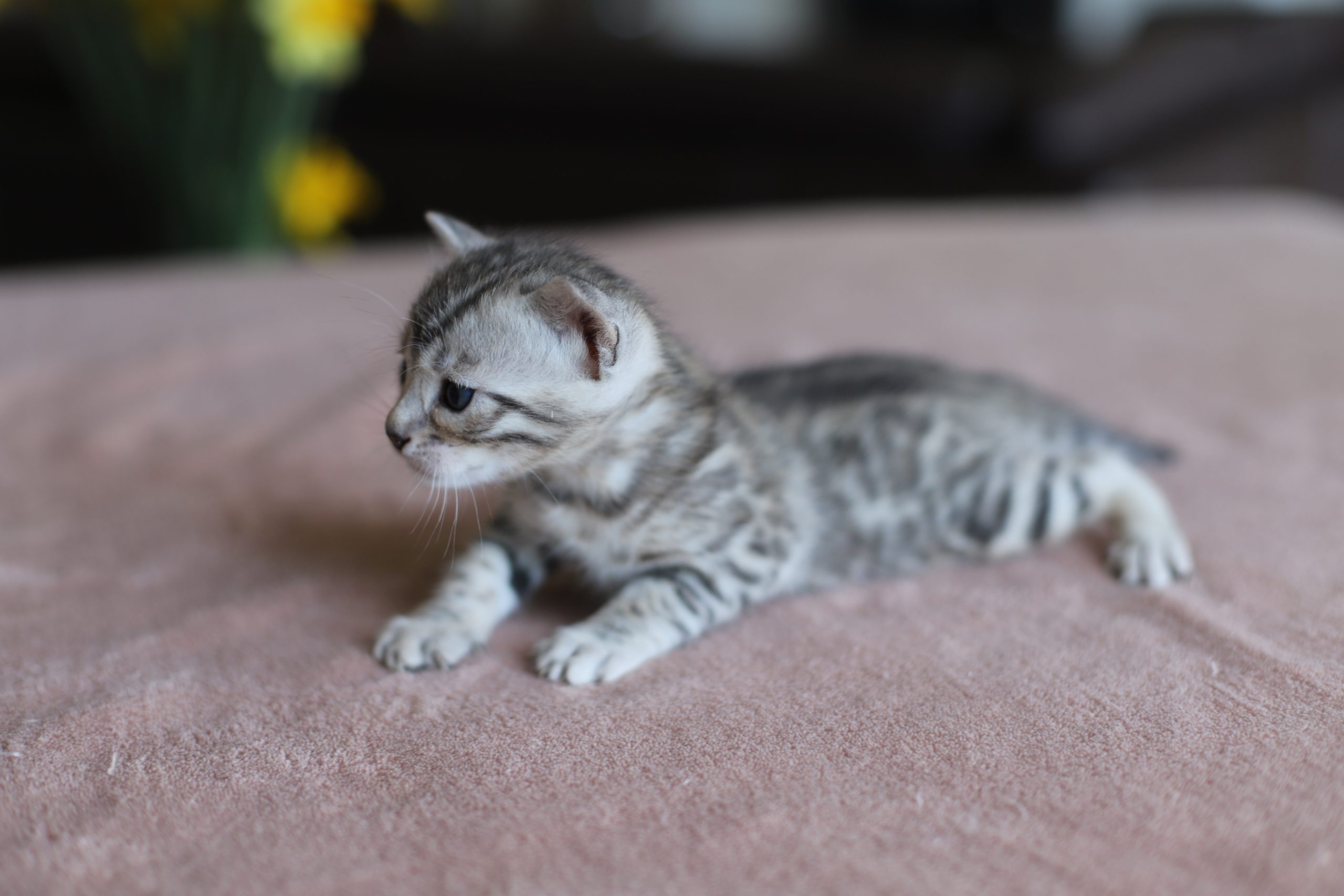 Un chaton superbe avec beaucoup de contraste, très typée. Elle a de nombreuses taches rondes jusque sur le dos. C’est un belle femelle pleine de vie.